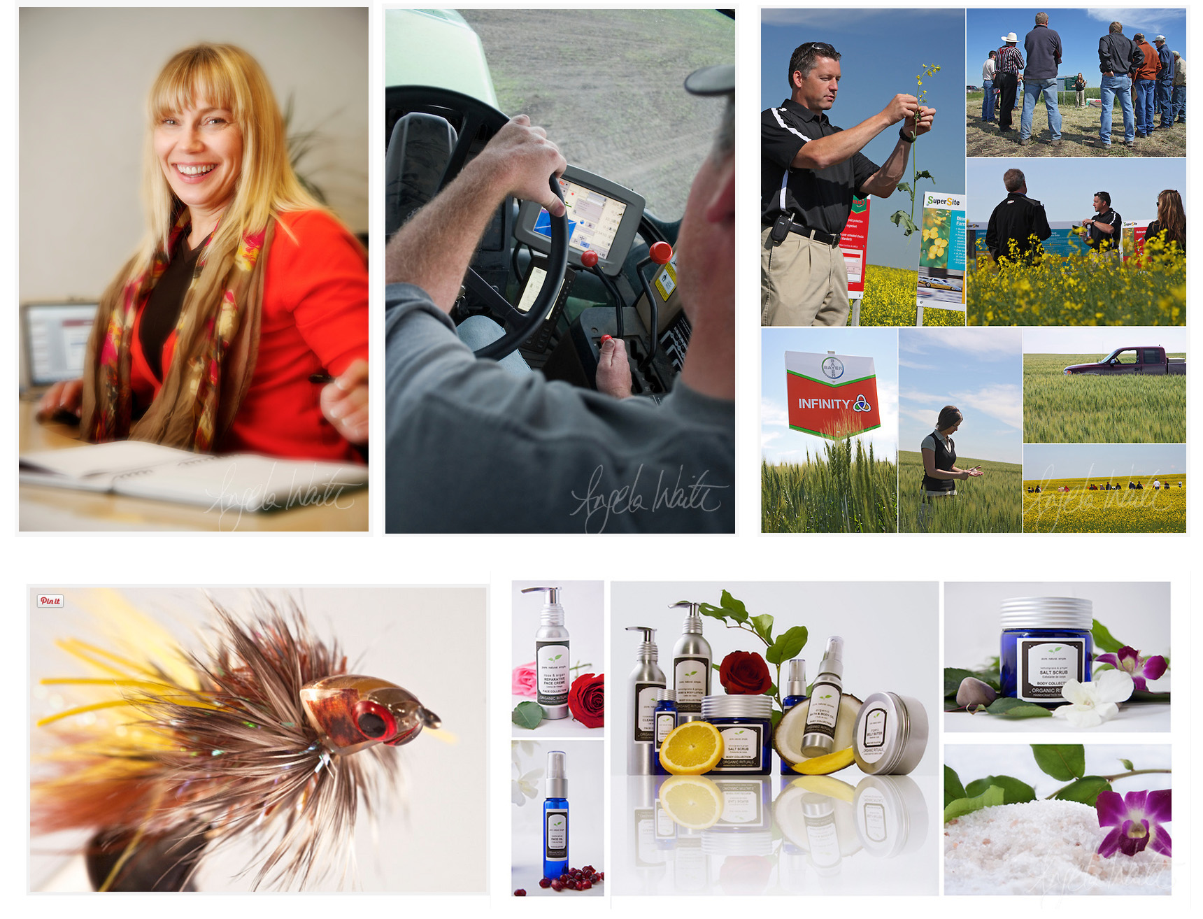 Examples of commercial portrait, environmental portrait, field tour, macro shoot of fly fishing flies, and product shoot.